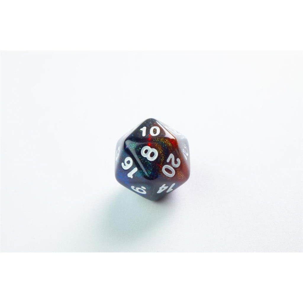 Een set van 7 RPG dobbelstenen met intergalactische, spetterende kleuren. Deze set bevat een D4, D6, D8, 2x D10, D12 en een D20.