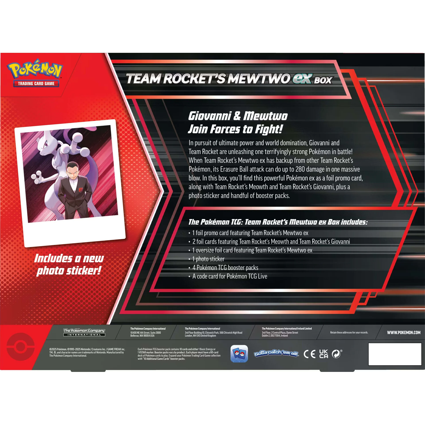 Giovanni & Mewtwo join forces to fight! In pursuit of ultimate power and world domination, Giovanni and Team Rocket are unleashing one terrifyingly strong Pokémon in battle! When Team Rocket’s Mewtwo ex has backup from other Team Rocket’s Pokémon, its Erasure Ball attack can do up to 280 damage in one massive blow. In this box, you’ll find this powerful Pokémon ex as a foil promo card, along with Team Rocket’s Meowth and Team Rocket’s Giovanni, plus a photo sticker and handful of booster packs.