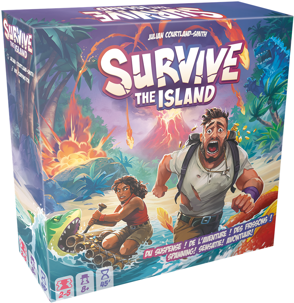 In Survive the Island stuur je een team van 10 avonturiers aan dat van een zinkend eiland probeert te ontsnappen. Elke avonturier draagt een schat met zich mee, waarvan de bijbehorende waarde onderop staat. Probeer zoveel mogelijk schatten te redden en zorg ervoor dat je avonturiers niet door monsters gepakt worden terwijl je ze naar veilige eilanden leidt… Doe dit allemaal voordat 3 van de 4 vulkanen uitbarsten!