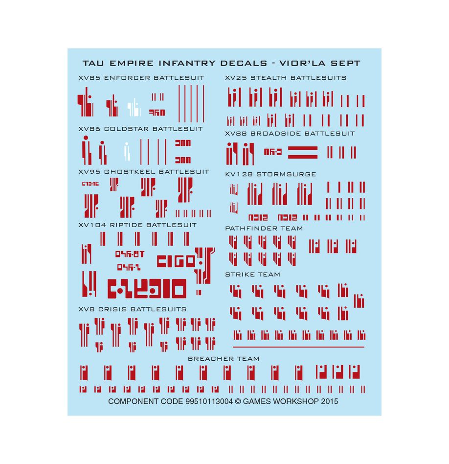 – 1x T'au Empire Infantry Decals – Vior'la Sept Transfer Sheet: 177x high-quality waterslide transfers to decorate your XV26 Stealth Battlesuits.